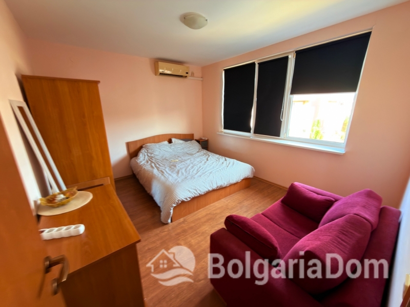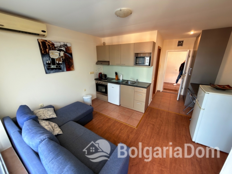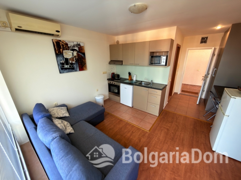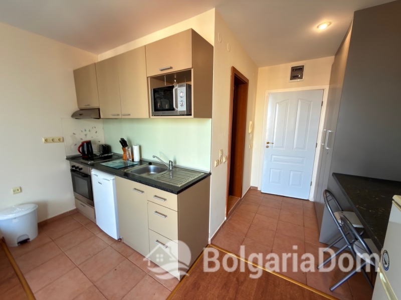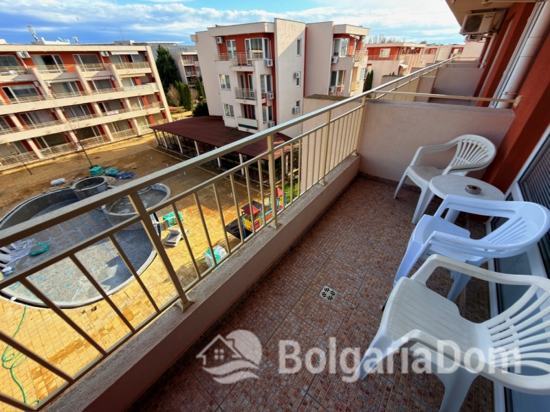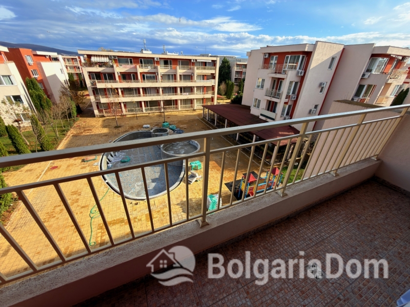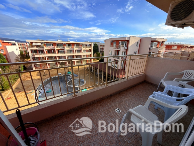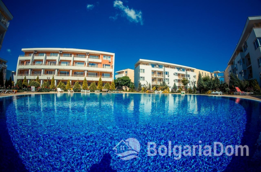 Nabízíme k prodeji dvoupokojový apartmán s výhledem na bazén ve velkém rodinném komplexu Nessebar Fort Noks Golf Club, Slunečné pobřeží.