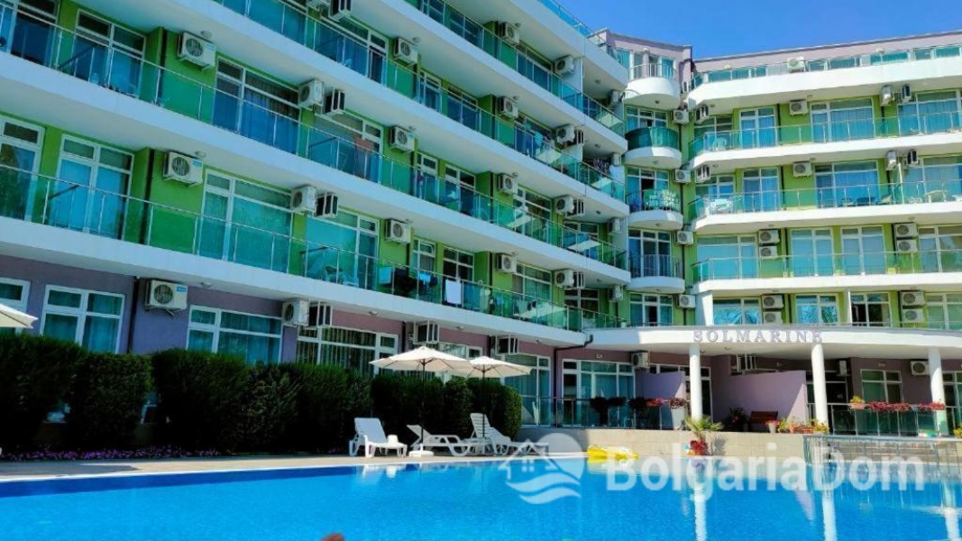 Apartmán o celkové rozloze 68 m² se nachází v pátém patře budovy s výtahem v komplexu Solmarin, Slunečné pobřeží.