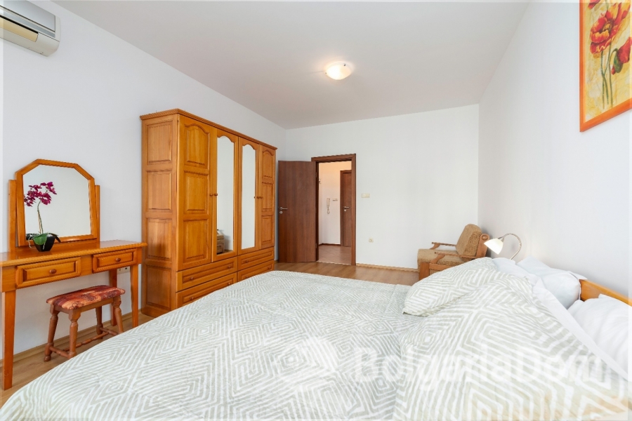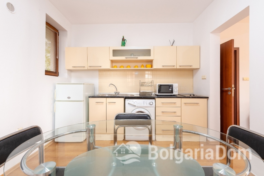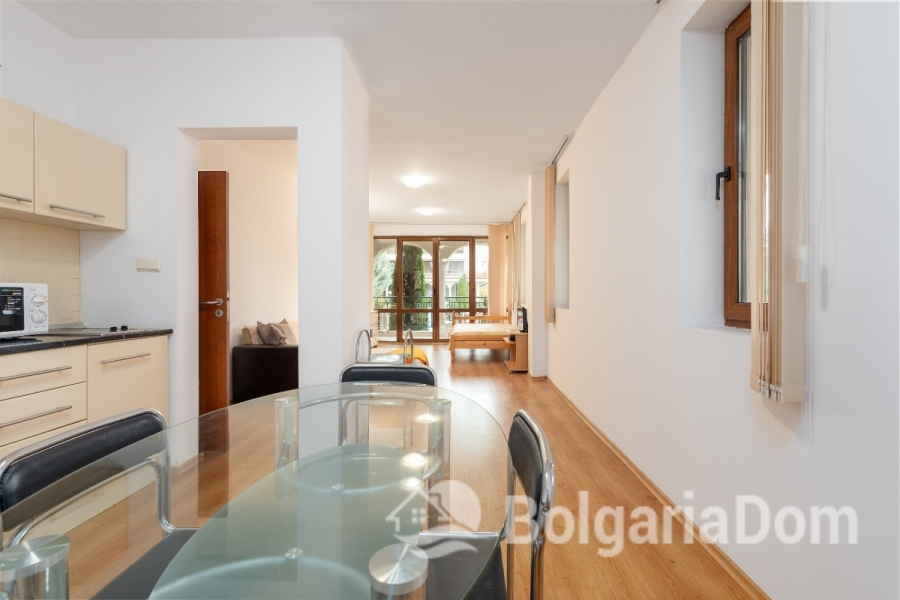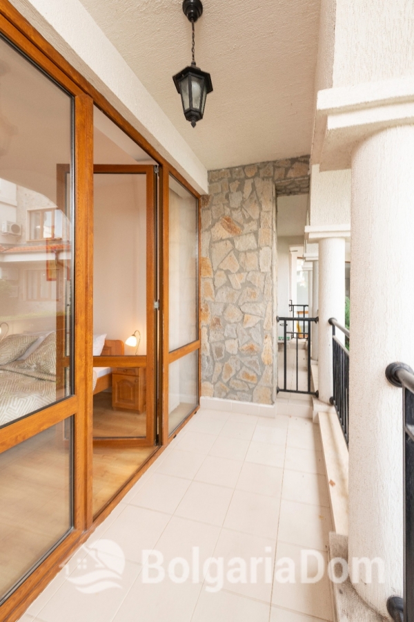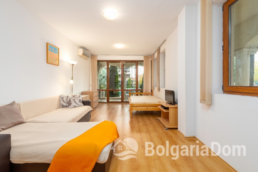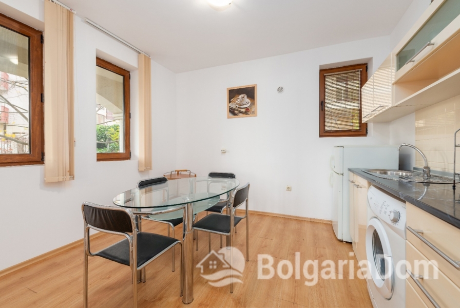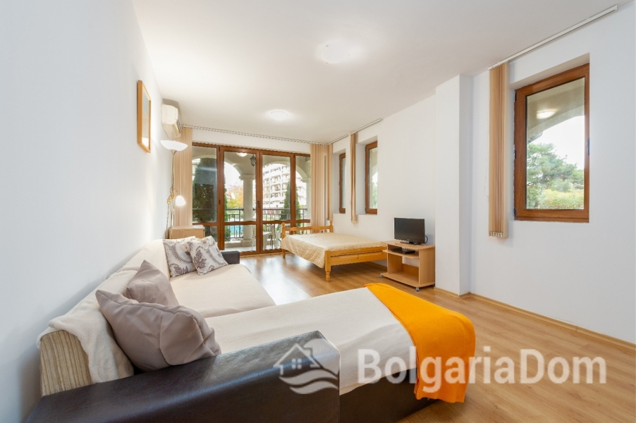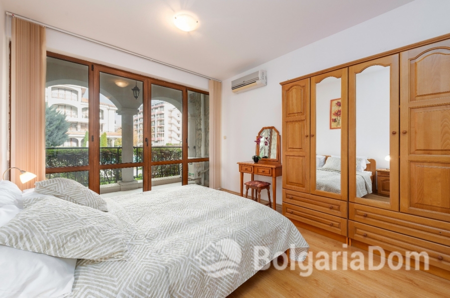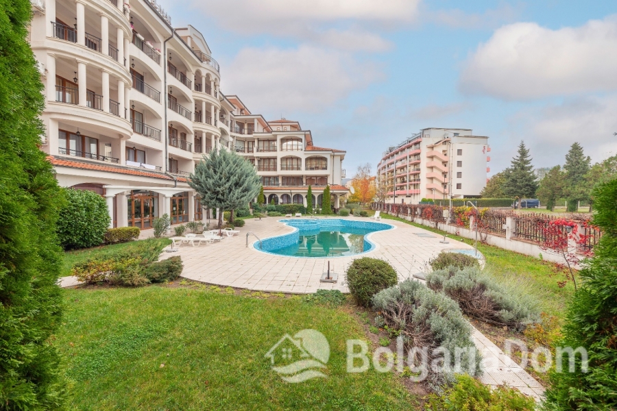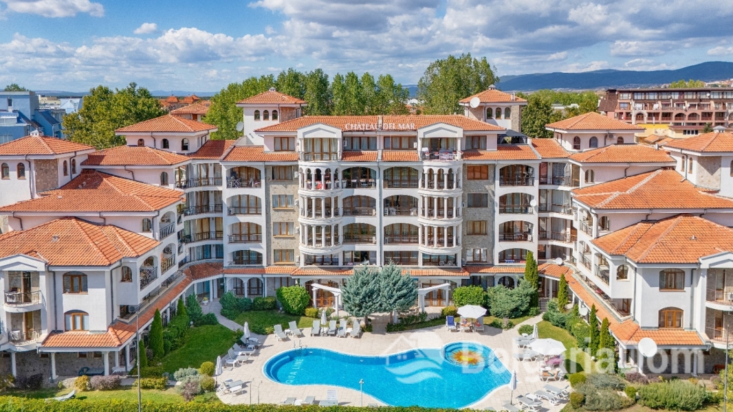 Wir bieten Ihnen eine exzellente 2-Zimmer-Wohnung mit herrlichem Poolblick in der Familienanlage Chateau Del Mar zum Kauf an. Die Anlage Chateau Del Mar befindet sich in Sonnenstrand, nur 5 Gehminuten vom Strand und 1,5 km vom Action Aquapark entfernt. Sie ist im mediterranen Stil erbaut und zeichnet sich durch ein harmonisches Zusammenspiel von Natur und Architektur aus. Der Innenhof (Patio) ist begrünt und liebevoll gestaltet. Diese 2-Zimmer-Wohnung hat eine Wohnfläche von 91 m². Sie verfügt über einen Eingangsbereich, ein Wohnzimmer mit Küche und Essbereich, ein separates Schlafzimmer, ein Badezimmer mit Dusche und einen Balkon. Von hier aus genießen Sie den Blick auf den Pool und die gepflegte Anlage. Die Wohnung befindet sich im Erdgeschoss und ist möbliert. Die Anlage ist in einem hervorragenden Zustand. Die Anlage bietet einen Außenpool mit Kinderbecken und eine Bar. Das Gebäude ist in Betrieb und unterliegt der Bauordnung (Act 16). Die jährlichen Instandhaltungskosten betragen 11,50 Euro/m².