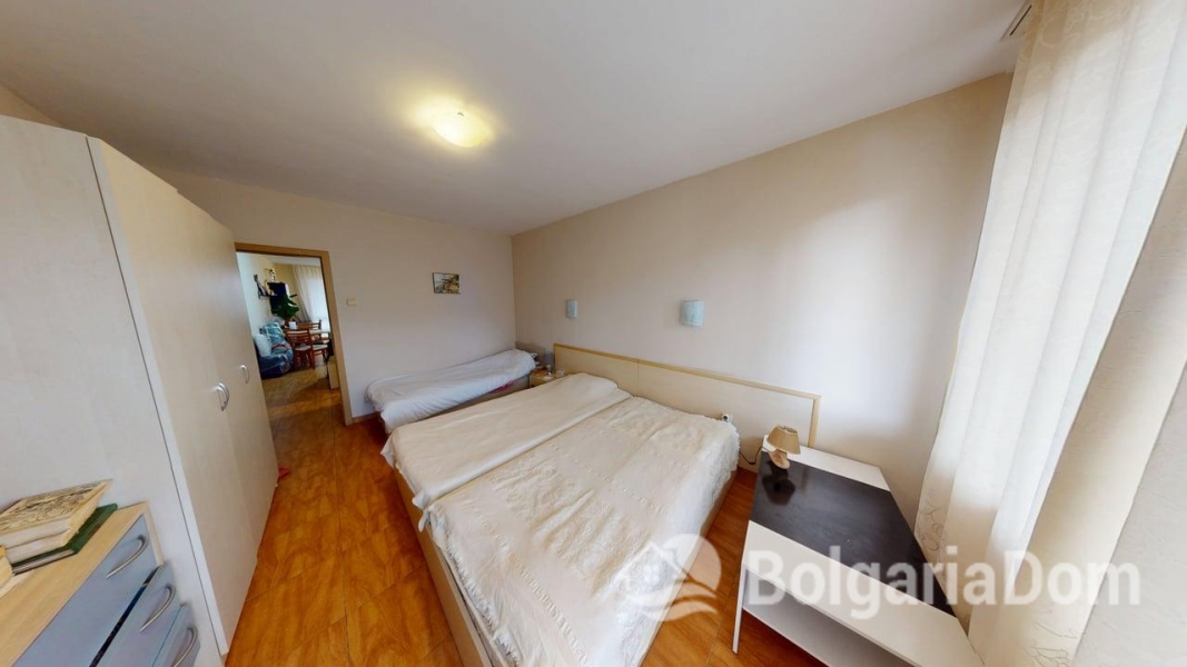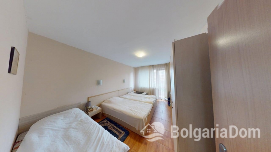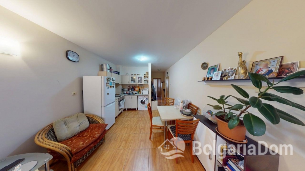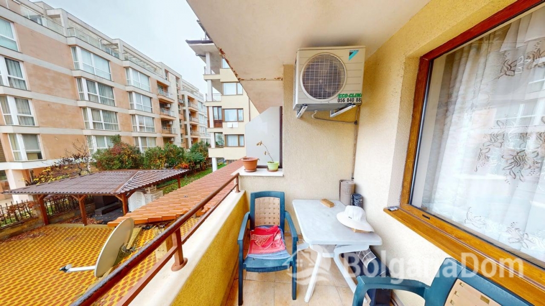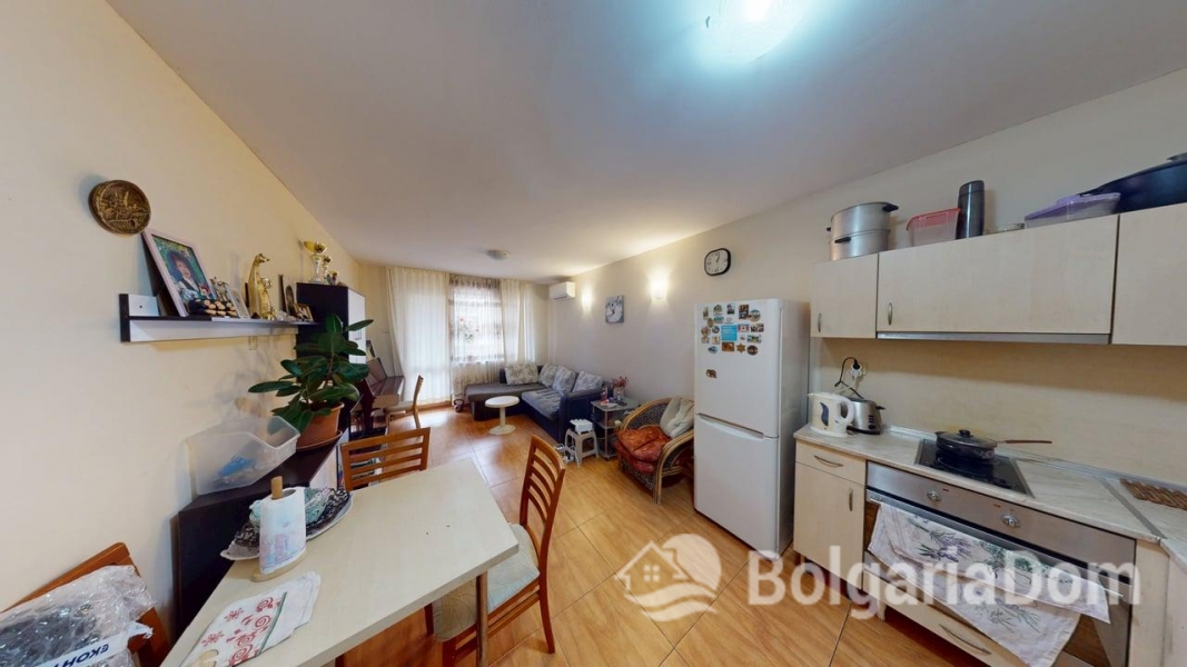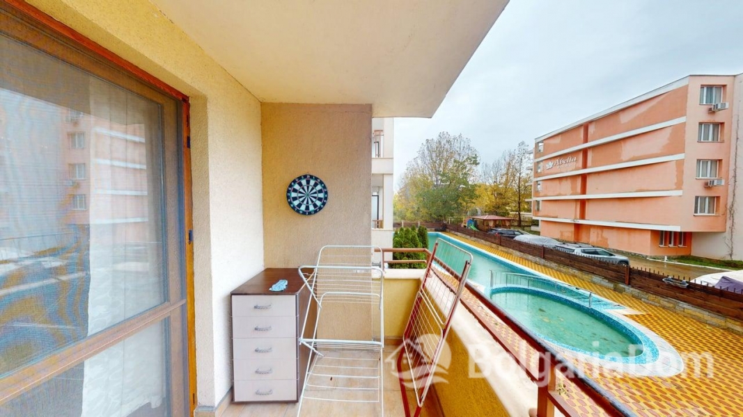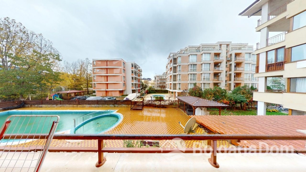 Wir bieten eine Einzimmerwohnung im Sunny Dreams Komplex in Sonnenstrand zum Verkauf an. Der Sunny Dreams Komplex befindet sich im Zentrum von Sonnenstrand. Die Lage ist hervorragend. Das Meer und das Ortszentrum sind jeweils nur 10 Gehminuten entfernt. Alle Annehmlichkeiten des täglichen Bedarfs sind bequem zu Fuß erreichbar: Geschäfte, Supermärkte, Restaurants, Cafés, Bars, Apotheken, ein Ärztezentrum, ein Busbahnhof, ein Wasserpark, Clubs und Bushaltestellen. Der Komplex eignet sich ideal zum ganzjährigen Wohnen. Die gepflegte Anlage bietet einen Swimmingpool mit Liege- und Ruhebereichen, einen Kinderspielplatz und ein Restaurant. Der Komplex ist in Betrieb genommen. Die Genehmigung nach Act 16 liegt vor. Die jährlichen Instandhaltungskosten betragen 9,60 Euro/m². Die Wohnung hat eine Fläche von 63 m² und befindet sich im zweiten Stock eines sechsstöckigen Gebäudes mit Aufzug. Aufteilung: Eingangsbereich, geräumiges Zimmer mit Kochnische, Schlafzimmer, Badezimmer mit Badewanne, Balkon mit Blick auf den Pool. Die Wohnung wird möbliert und inklusive Haushaltsgeräten verkauft.