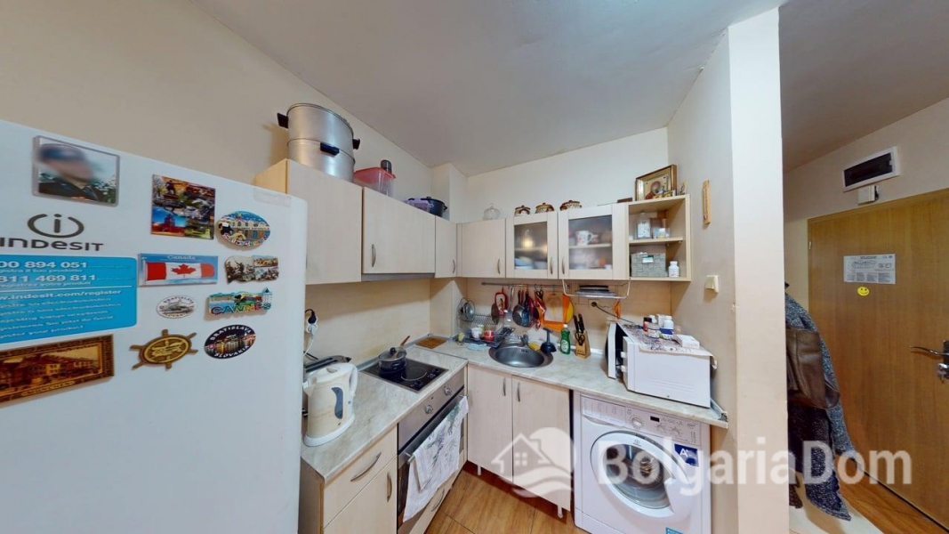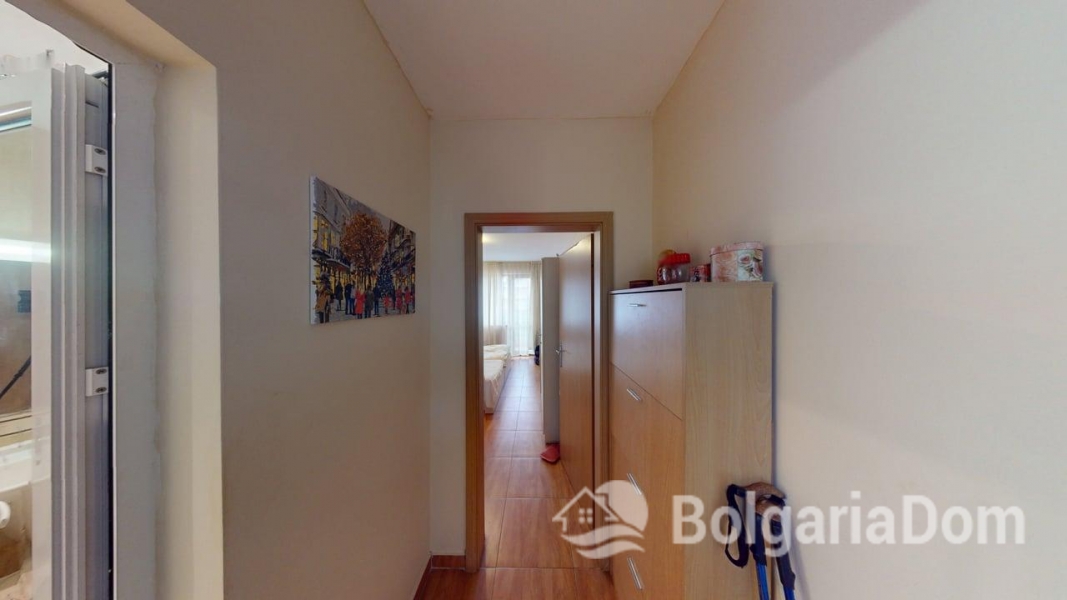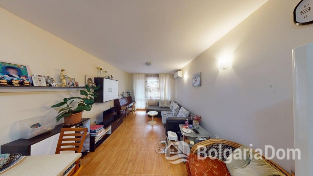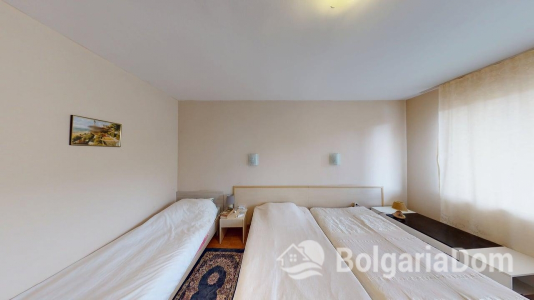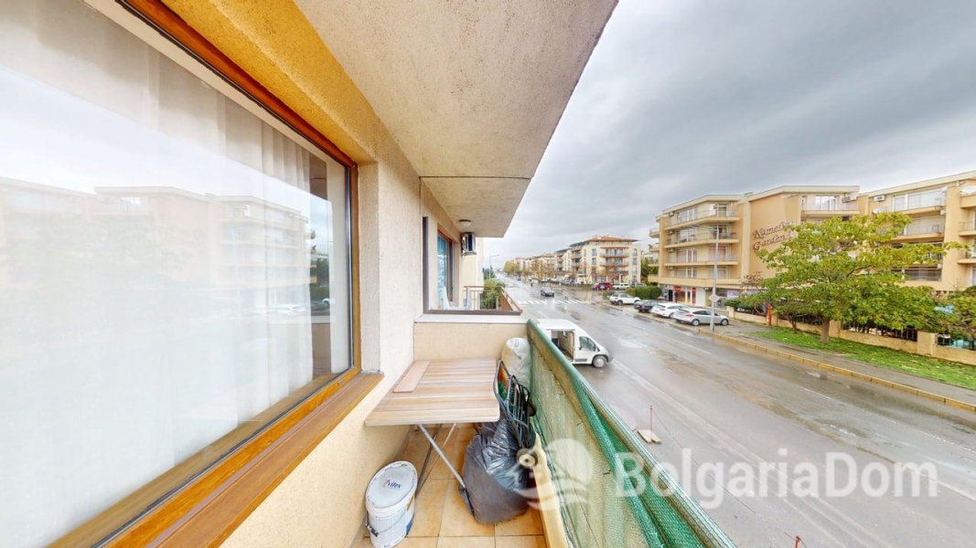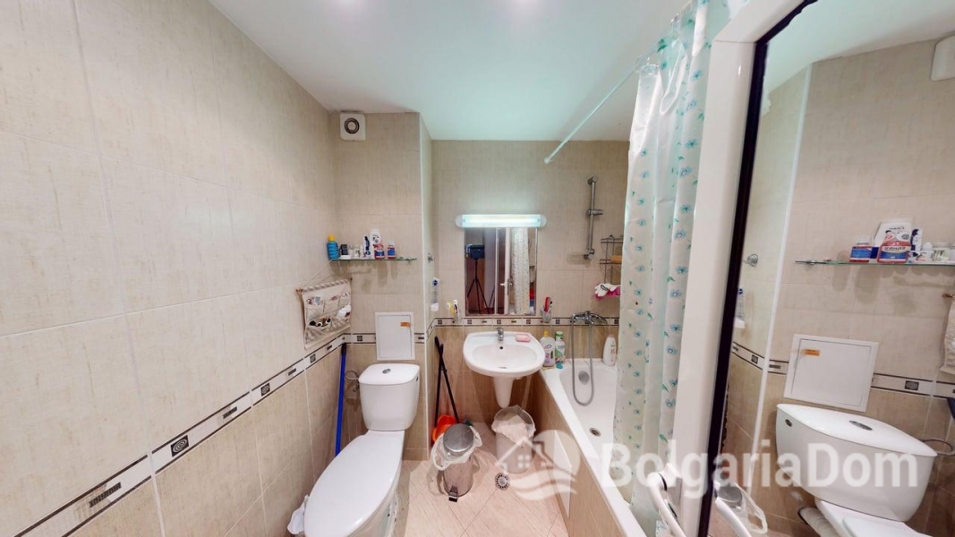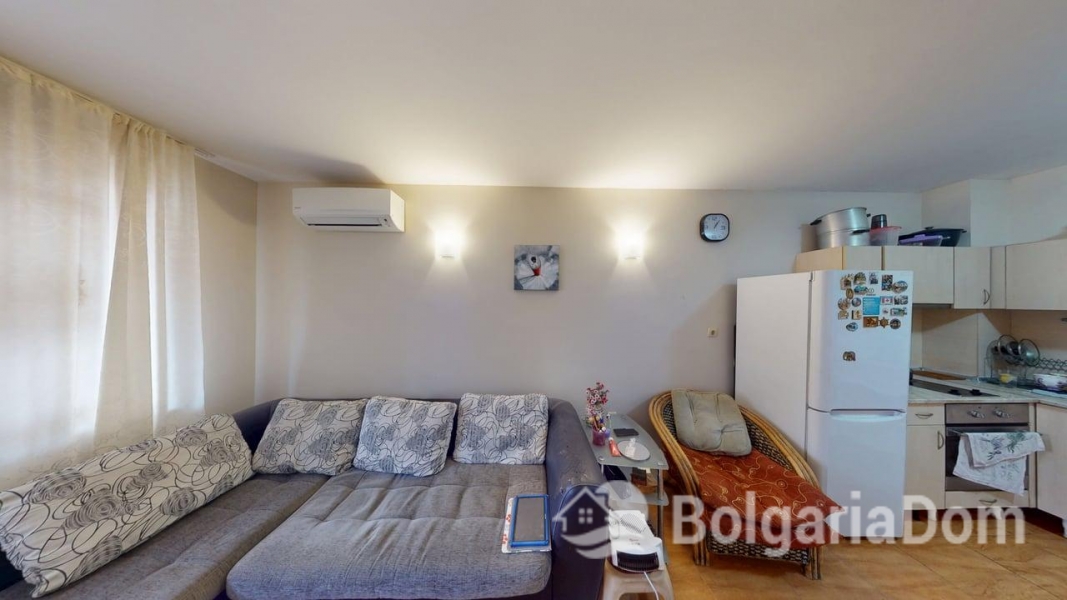 Wir bieten eine Einzimmerwohnung im Sunny Dreams Komplex in Sonnenstrand zum Verkauf an. Der Sunny Dreams Komplex befindet sich im Zentrum von Sonnenstrand. Die Lage ist hervorragend. Das Meer und das Ortszentrum sind jeweils nur 10 Gehminuten entfernt. Alle Annehmlichkeiten des täglichen Bedarfs sind bequem zu Fuß erreichbar: Geschäfte, Supermärkte, Restaurants, Cafés, Bars, Apotheken, ein Ärztezentrum, ein Busbahnhof, ein Wasserpark, Clubs und Bushaltestellen. Der Komplex eignet sich ideal zum ganzjährigen Wohnen. Die gepflegte Anlage bietet einen Swimmingpool mit Liege- und Ruhebereichen, einen Kinderspielplatz und ein Restaurant. Der Komplex ist in Betrieb genommen. Die Genehmigung nach Act 16 liegt vor. Die jährlichen Instandhaltungskosten betragen 9,60 Euro/m². Die Wohnung hat eine Fläche von 63 m² und befindet sich im zweiten Stock eines sechsstöckigen Gebäudes mit Aufzug. Aufteilung: Eingangsbereich, geräumiges Zimmer mit Kochnische, Schlafzimmer, Badezimmer mit Badewanne, Balkon mit Blick auf den Pool. Die Wohnung wird möbliert und inklusive Haushaltsgeräten verkauft.