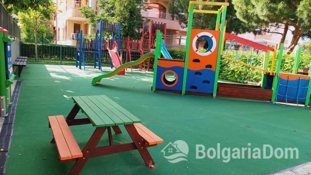 The complex is located in the central part of the resort. All amenities are within walking distance: the bus station, shops, cafes, restaurants, souvenir shops, attractions, and much more. This is a developed area where everything is open year-round. The complex features an outdoor pool, a children's playground, relaxation areas with sun loungers and umbrellas, security, parking, and a reception desk. The grounds are landscaped and well-maintained.