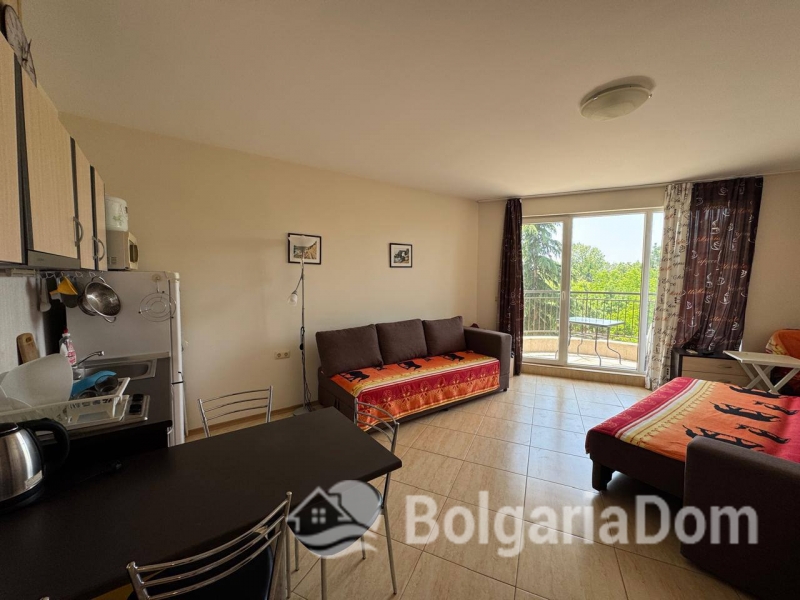 About the apartment: Area: 45 sq. m. 4th floor in a building with an elevator. Layout: entrance hall, spacious living room with separate kitchen and dining area, bathroom, and balcony with sea views. The apartment is sold furnished and equipped.