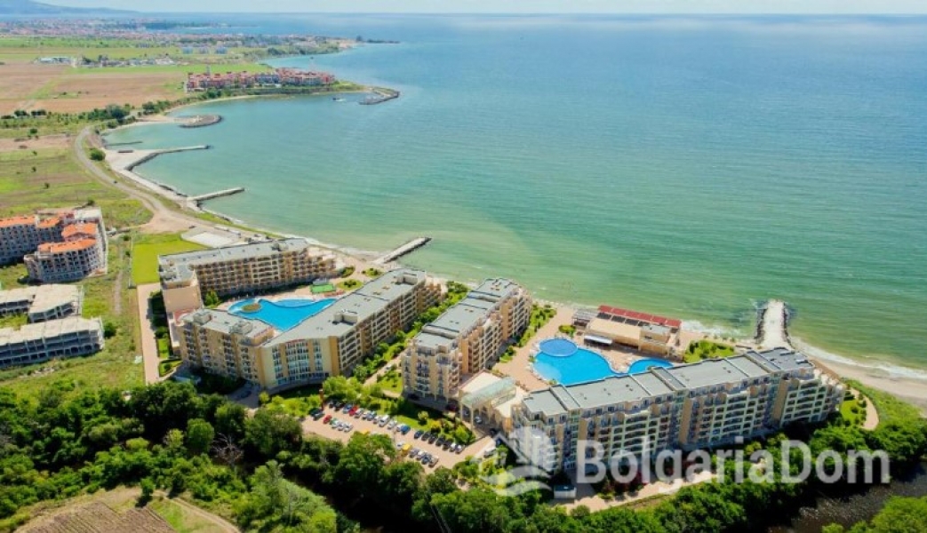 The studio is located on the beachfront in the high-quality Midia Resort residential complex—in a picturesque area of Aheloy, just a few minutes' drive from Sunny Beach, Nessebar, and Pomorie, and only 19 km from Burgas Airport. The Marina Cape complex boasts well-developed infrastructure and is suitable for year-round living. The center of Aheloy, with its year-round amenities, is within walking distance.
