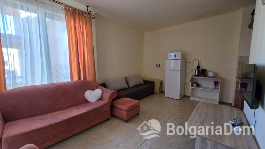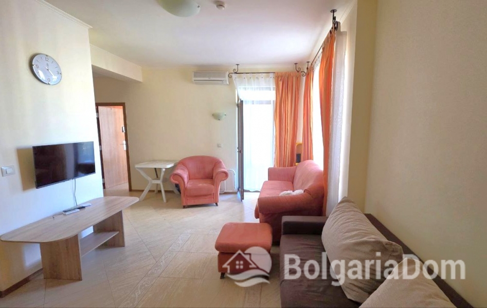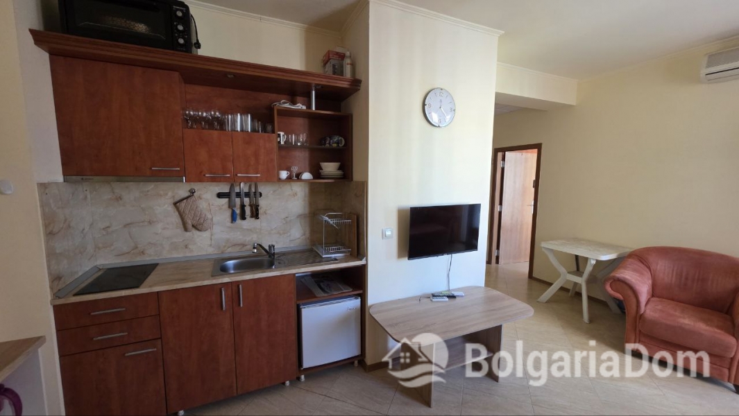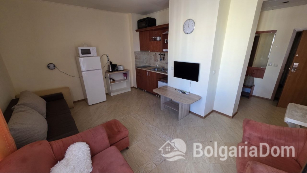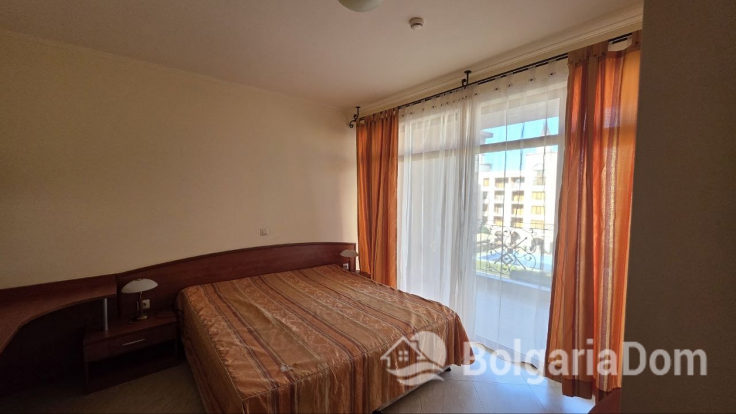 This one-bedroom apartment is located in the Palazzo complex, in the southern part of Sunny Beach. The complex features an outdoor swimming pool, a children's pool, recreation areas, a shop, security, and well-maintained grounds.