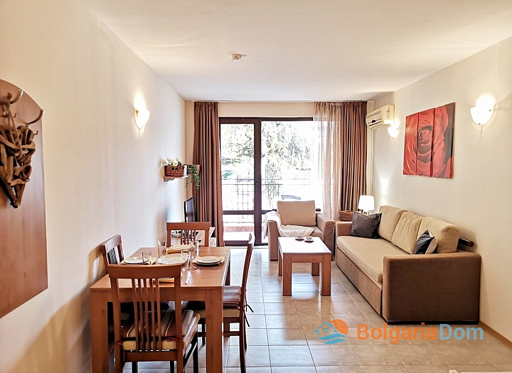 Предлагаем на продажу красивую двухкомнатную квартиру в отличном комплексе на курорте Солнечный Берег, вторая линия от пляжа и в пешей доступности от Строго города в Несебре.