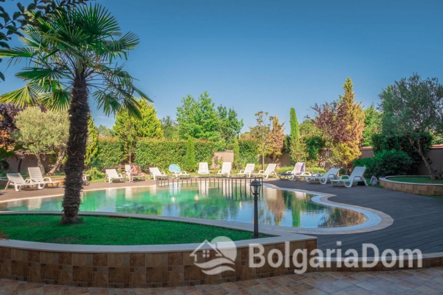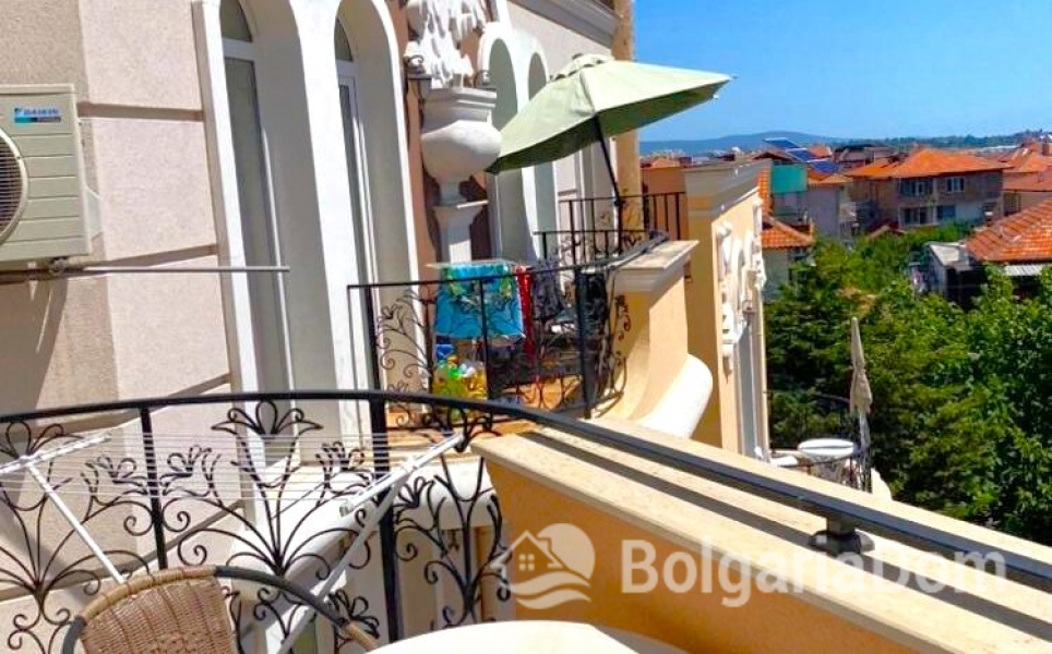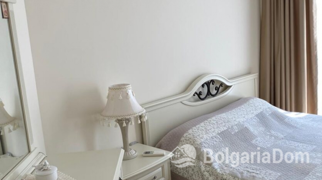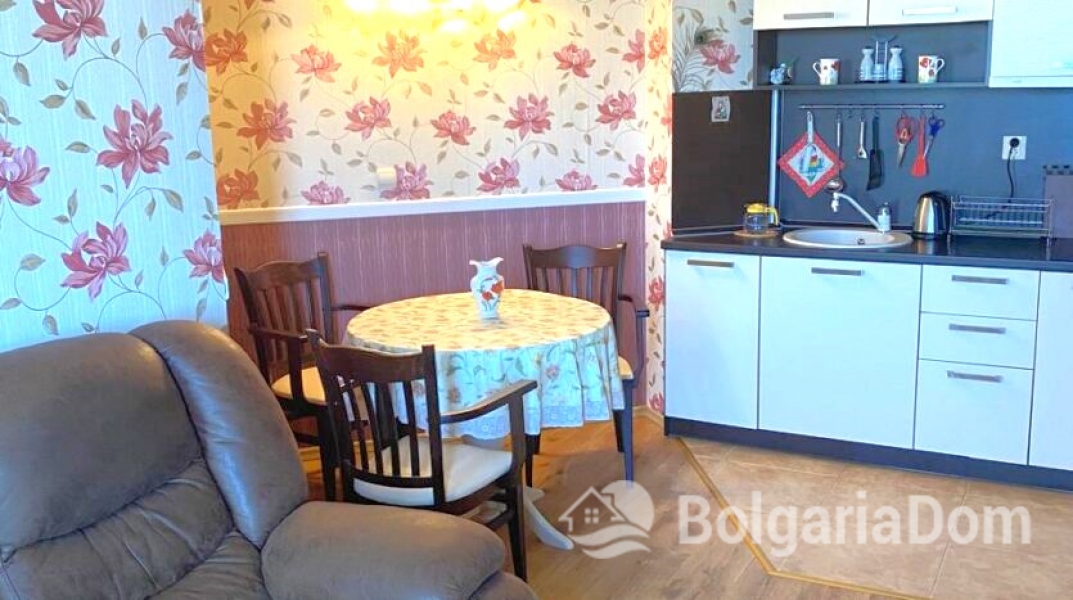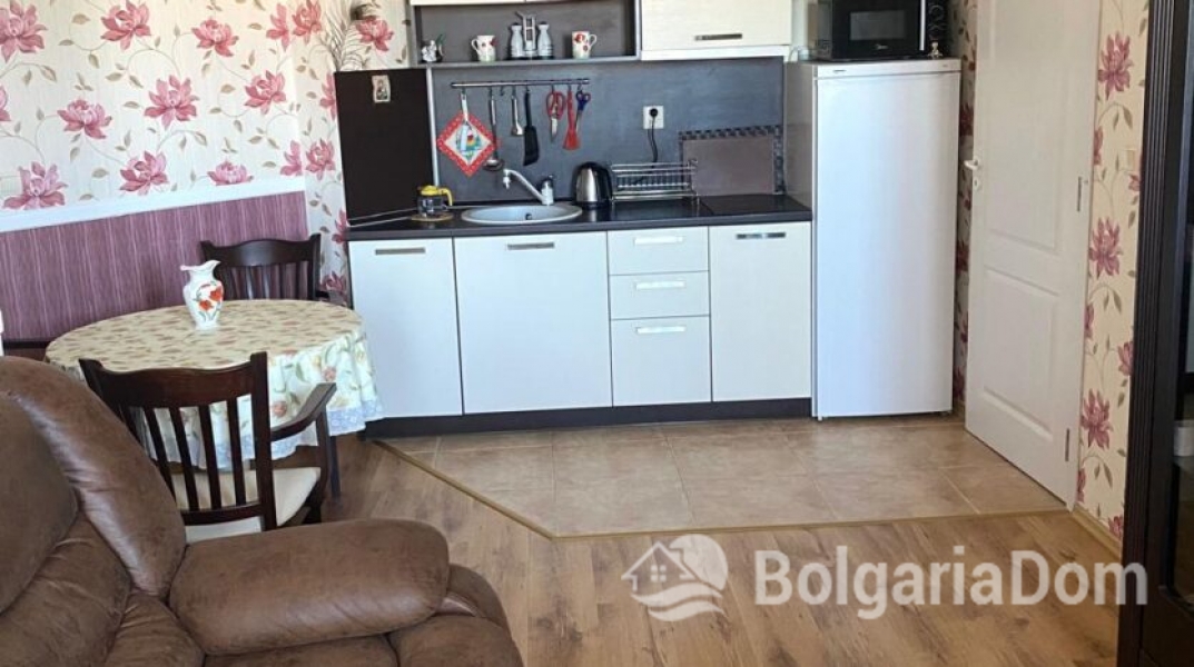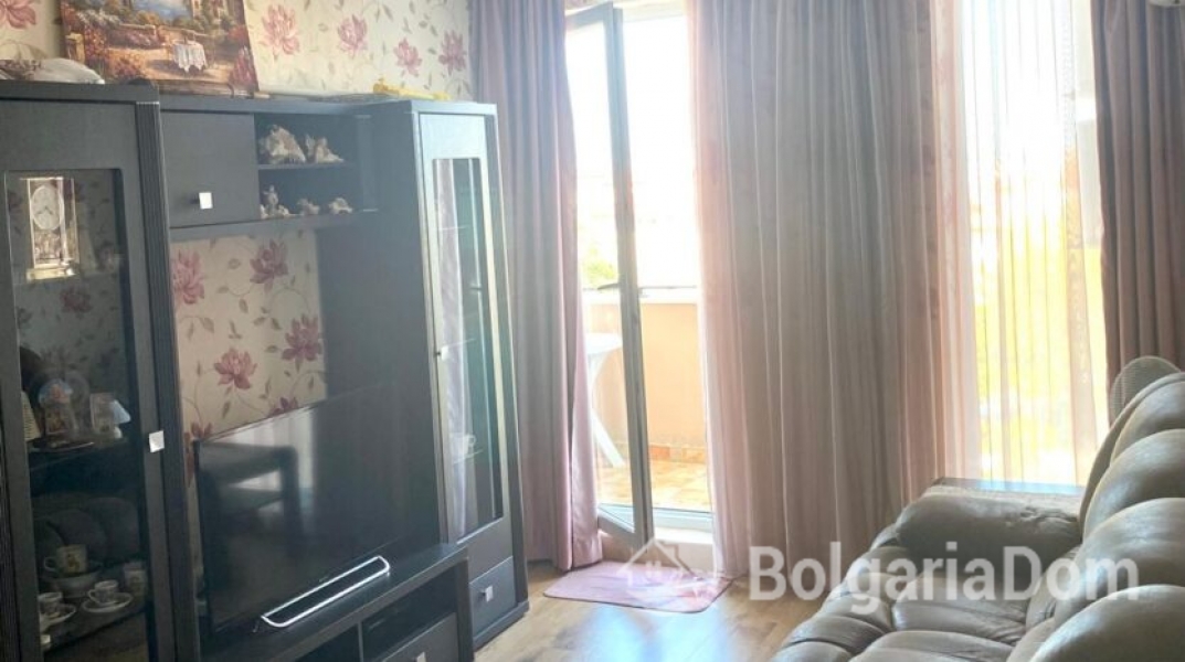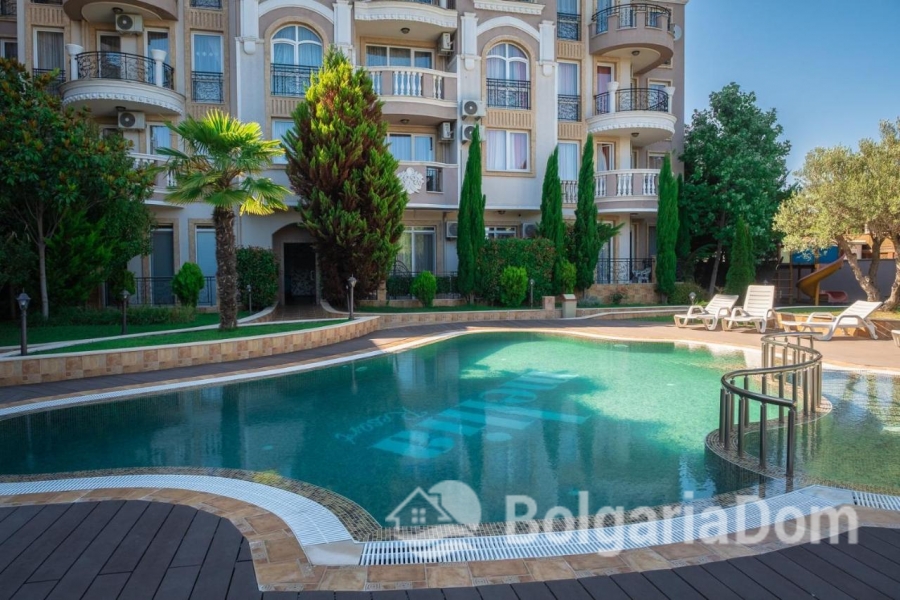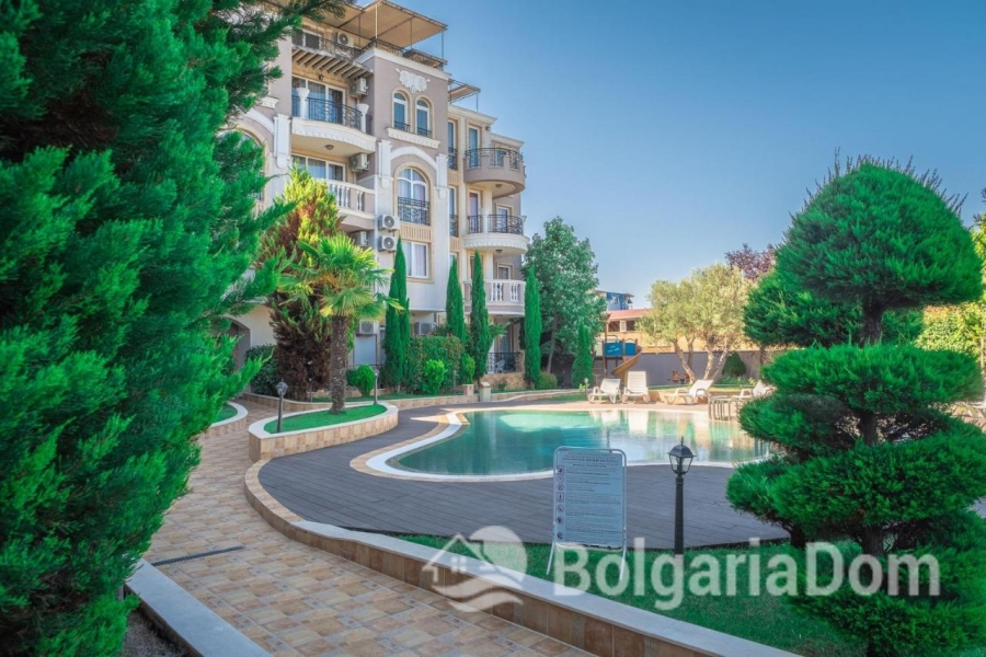 Предлагаем на продажу отличную двухкомнатную квартиру с видом на бассейн и небольшим видом на море в комплексе Мелия 8, в тихом квартале поселка Равда.