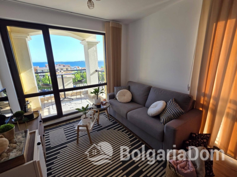 Двухкомнатная квартира имеет общую площадь 53.94 кв.м. Планировка: гостиная с кухонной зоной, спальня, ванная комната с душевой кабиной, балкон с зоной для отдыха. Потрясающий вид на море!