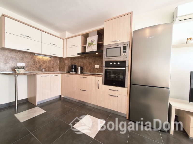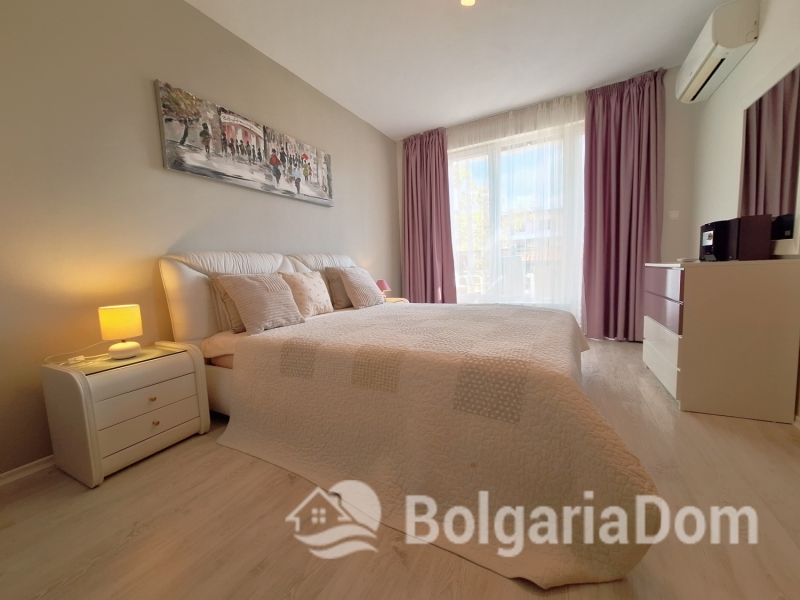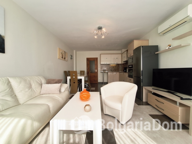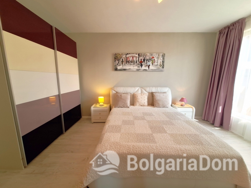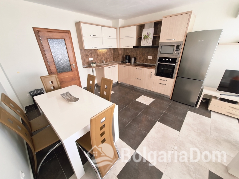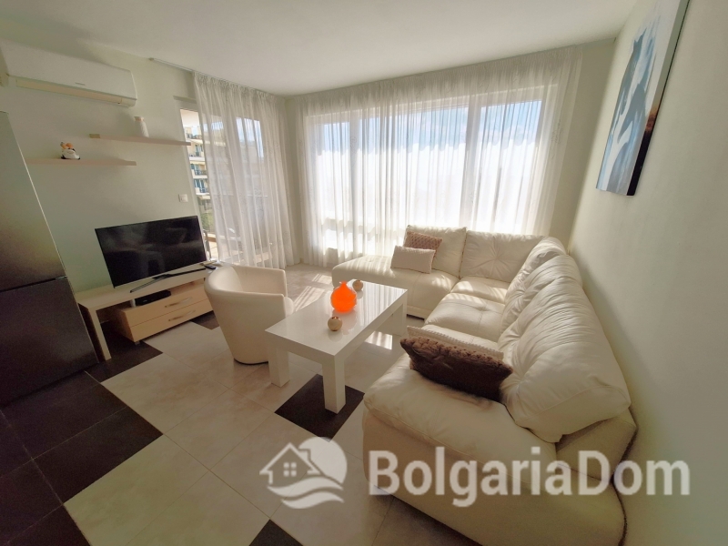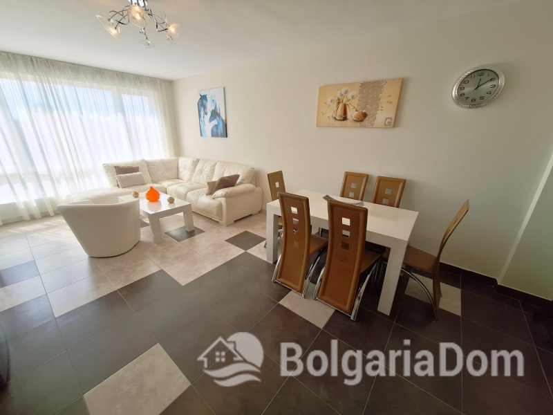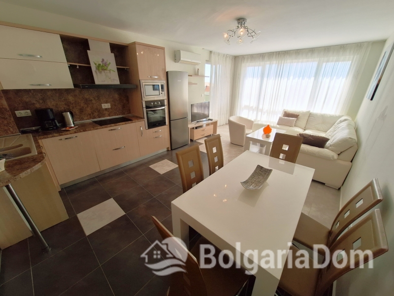 Предлагаем на продажу отличную и просторную трехкомнатную квартиру с видом на море, парко-местом, новой мебелью и бытовой техникой в качественном здании в центре курорта Святой Влас.