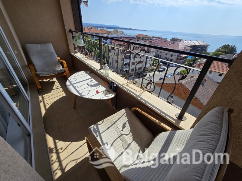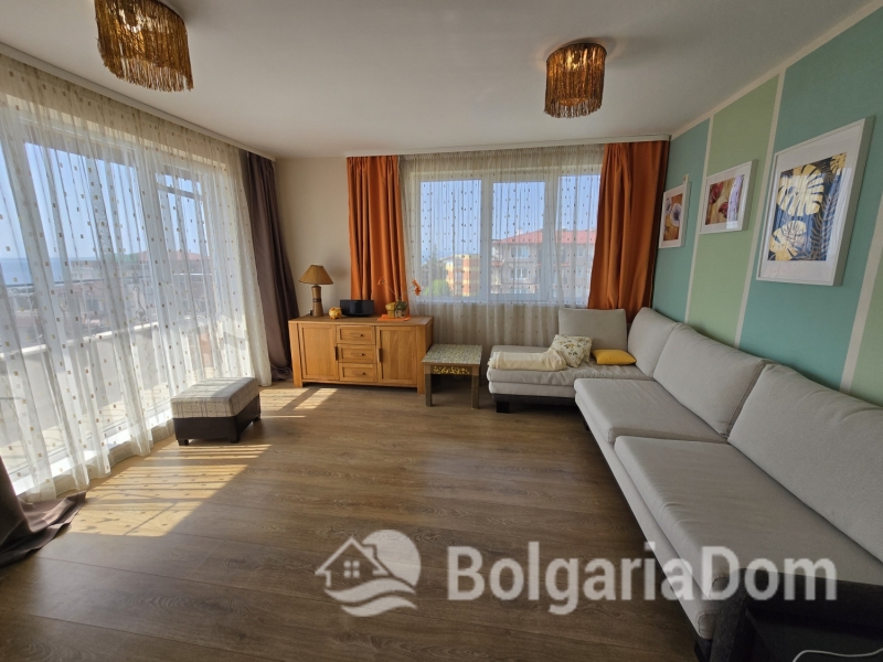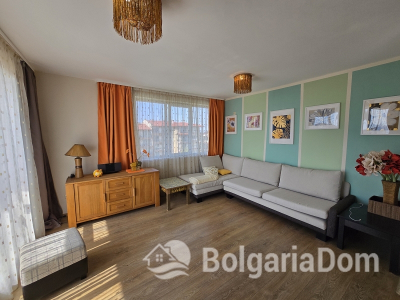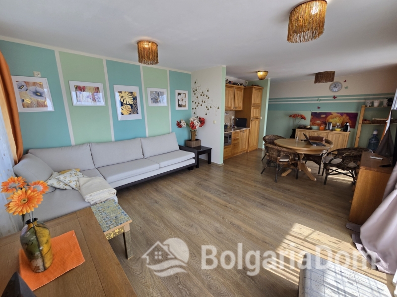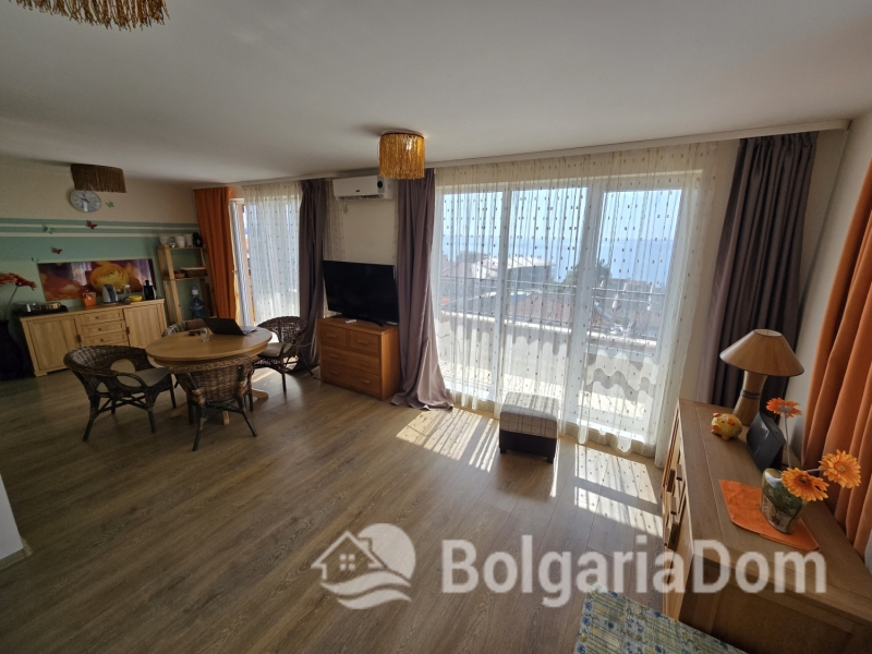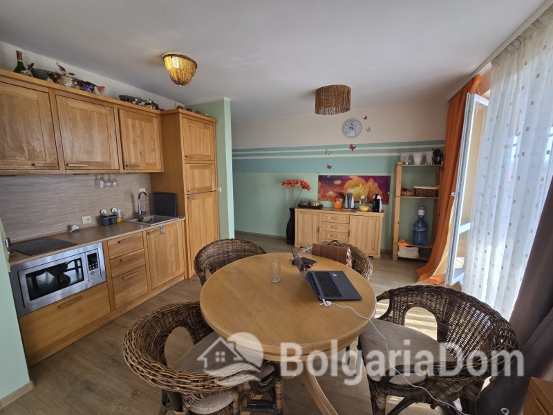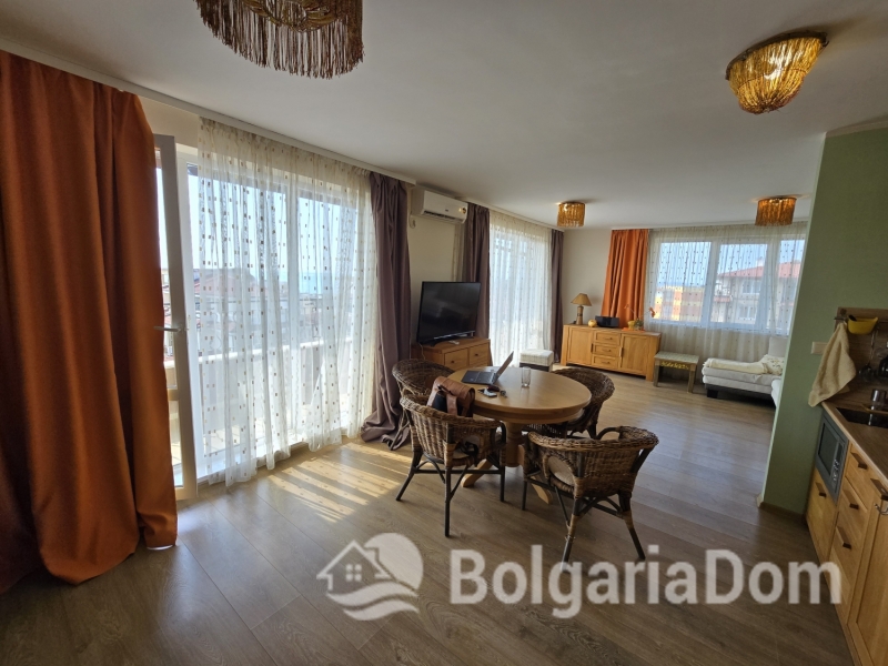 Планування: повноцінна передпокій, простора вітальня з кухонною та обідньою зонами, спальня, ванна кімната, велика тераса із зоною для відпочинку. Чудовий вид на море. . Квартира укомплектована меблями та технікою. Відмінний стан.